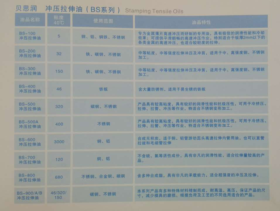 針對(duì)以上問(wèn)題,中陽(yáng)潤(rùn)滑油科技公司推出了易清洗不銹鋼拉伸油系列,“貝思潤(rùn)”易清洗不銹鋼拉伸油專為硬鋼板高難度拉伸,沖壓成型和厚板沖剪,開料以及管材拉拔而設(shè)之高油膜強(qiáng)度潤(rùn)滑油。含極壓、潤(rùn)滑、冷卻及防銹添加劑等多種添加劑,具有高粘度,高油膜強(qiáng)度和高極壓等特性。能有效防止模具和制品拉花及燒結(jié),減少模具的磨損,提高產(chǎn)品質(zhì)量和延長(zhǎng)模具的壽命。最重要的是,使用本產(chǎn)品由于加入了表面活性劑,可兌水,因而極易清洗,能夠在沖壓后及時(shí)去除干凈。